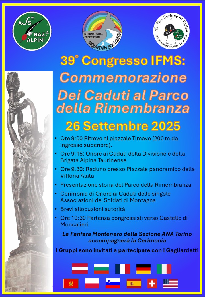 In occasione del 39° Congresso della Federazione Internazionale dei Soldati di Montagna (IFMS) che si terrà a Torino dal 23 al 26 Settembre 2025, la mattina del 26 Settembre si svolgerà una Cerimonia in Memoria dei Caduti di tutte le 11 Associazioni nazionali, a cui parteciperanno a cui sono invitati i Gruppi della Sezione di […]