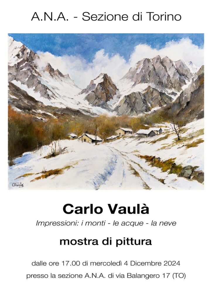 Un Socio di Torino- Centro, Carlo VAULA’, classe 1938 – S. Ten . del Genio Trasmissioni , ha il piacere di esporre alcuni suoi quadri, in Sede, il 4 Dicembre 2024. La sua opera pittorica è dedicata alla montagna , sempre amata e rispettata , e rappresentata con quel umile spirito alpino che ci ha fatto partire “ Dai fidi tetti del villaggio…” per il nostro Servizio militare. Potete trovare nei dipinti delle sue amate montagne alcune di quelle “…nude rocce e perenni ghiacciai …“ nella preghiera che abbiamo recitato tante volte e in tante circostanze.